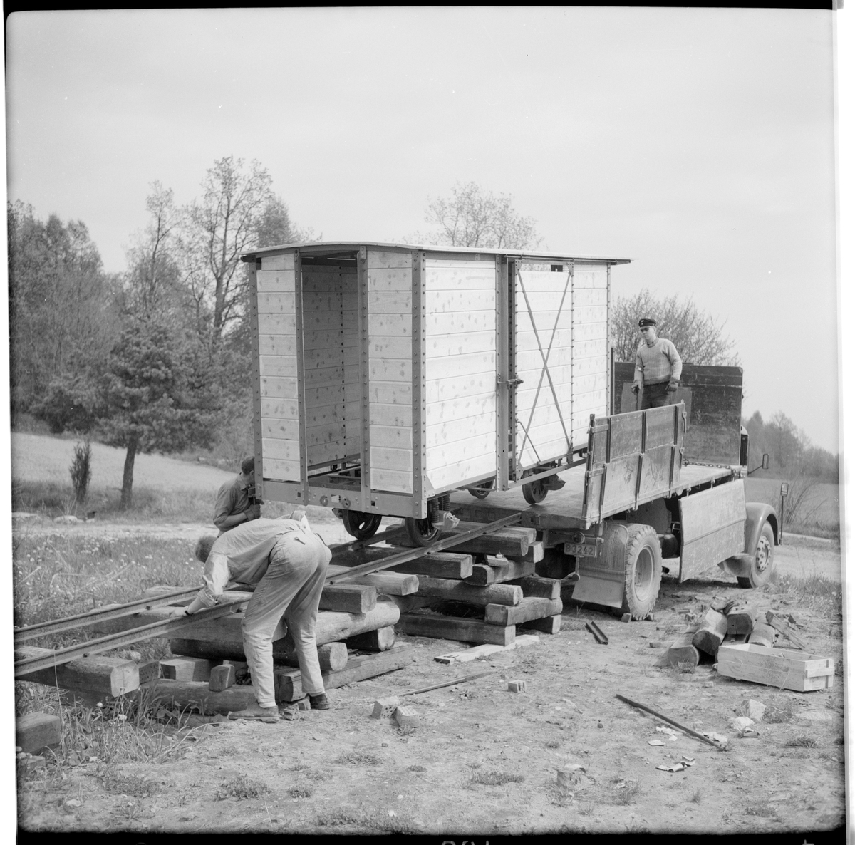 Avlastning av den nytillverkade godsvagnen. Troligen tillverkad av Museijärnvägen, ÖSlJ Östra Södermanlands Järnväg, ÖSlJ.