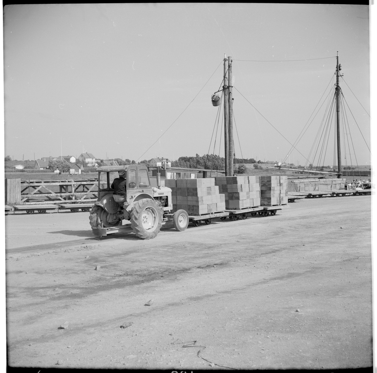 Gods transporteras av traktor på kaj.