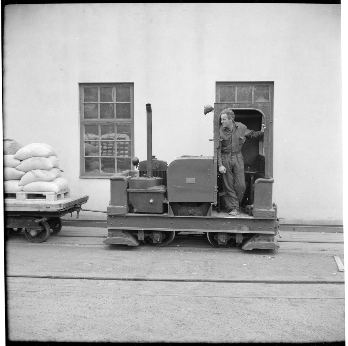 Förare i motorloket av Simplex vid pappersbruket i Håverud.