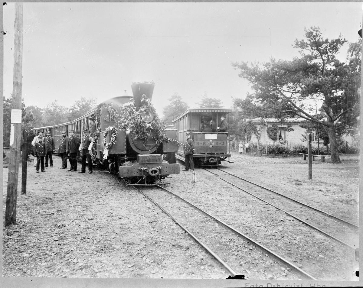 Helsingborg - Råå - Ramlösa Järnväg, HRRJ lok 2 "Helsingborg" och öppna sommarvagnar vid Ramlösabrunn. Femte man från vänster, lokförare Nils Rubin.