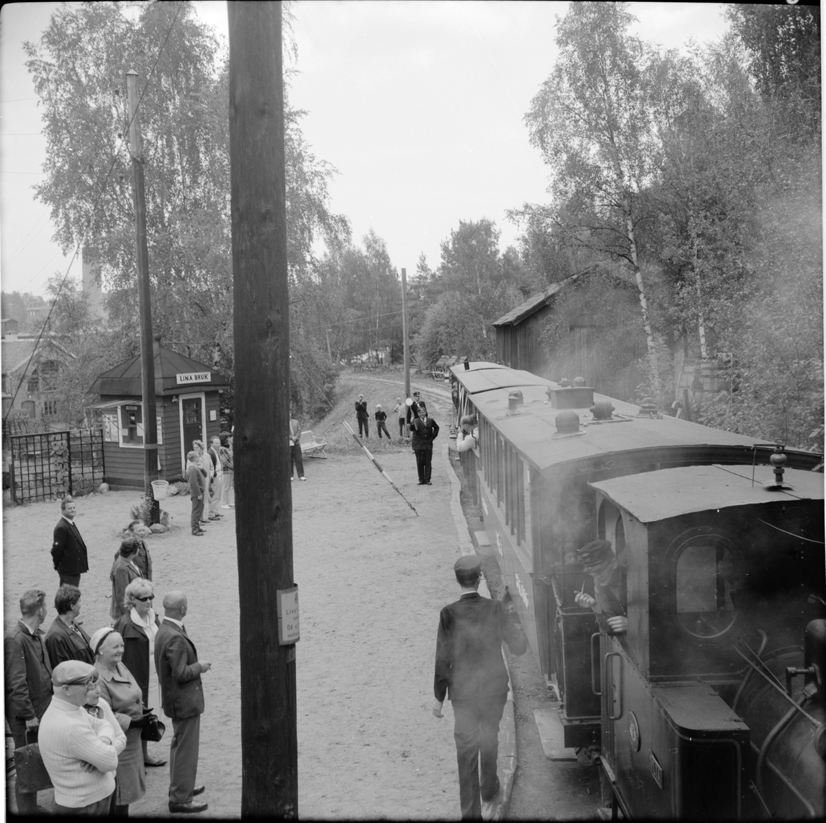 Stins vinkar klart för avresa för Museijärnvägen Östra Södermanlands Järnväg, ÖSlJ persontåg med lok "Dylta" vid Lina bruk.