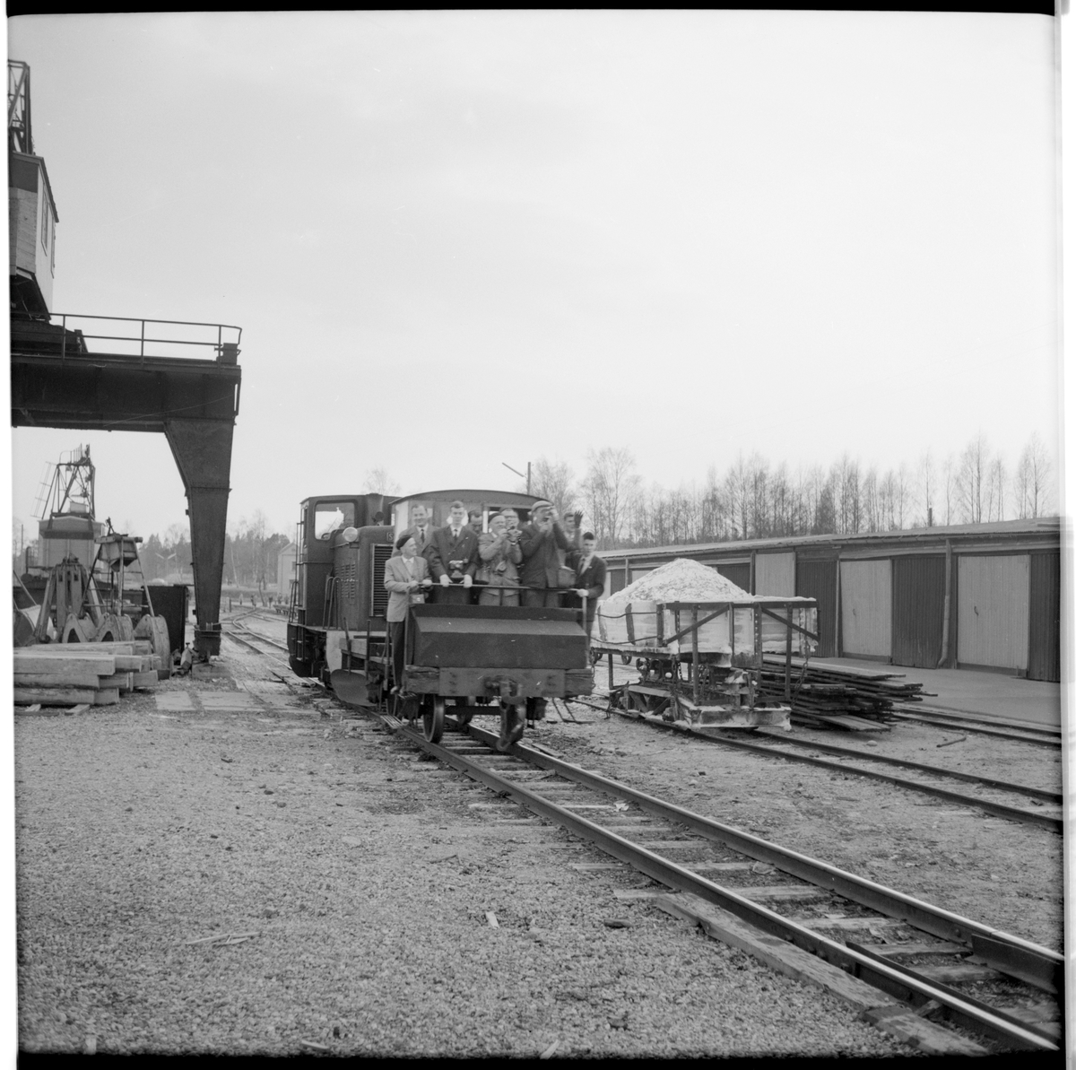En grupp fotografer på Dala - Ockelbo - Norrsundets Järnvägar, DONJ växellok Schoema som tillhör pappersmassa-fabriken i Norrsundet.