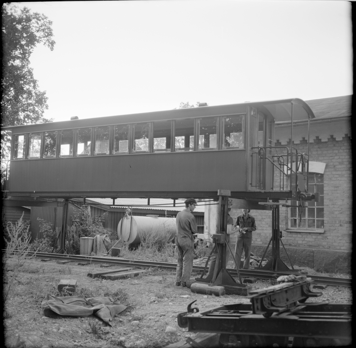 Museijärnvägen, Östra Södermanlands Järnväg, ÖSlJ:s personvagn står uppställd på bockar utanför lokstallet i Mariefred.