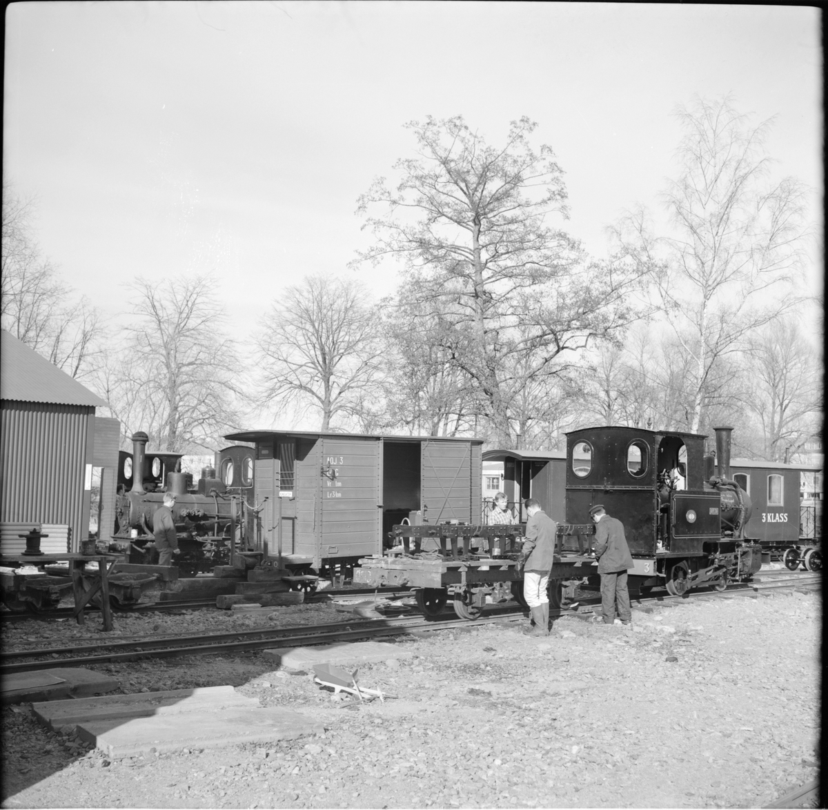 På järnvägsstationen i Mariefred ses Museijärnvägen, Östra Södermanlands Järnväg, ÖSlJ fordon: Anneberg - Ormaryds Järnväg, AOJ godsvagn 3 och till höger lok 3 "Dylta".