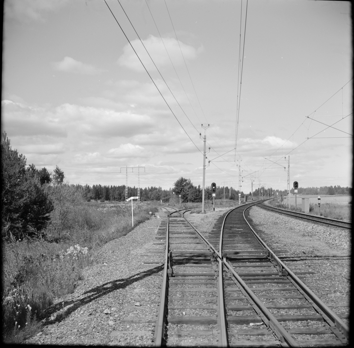 Vy över järnvägsspår med växel.