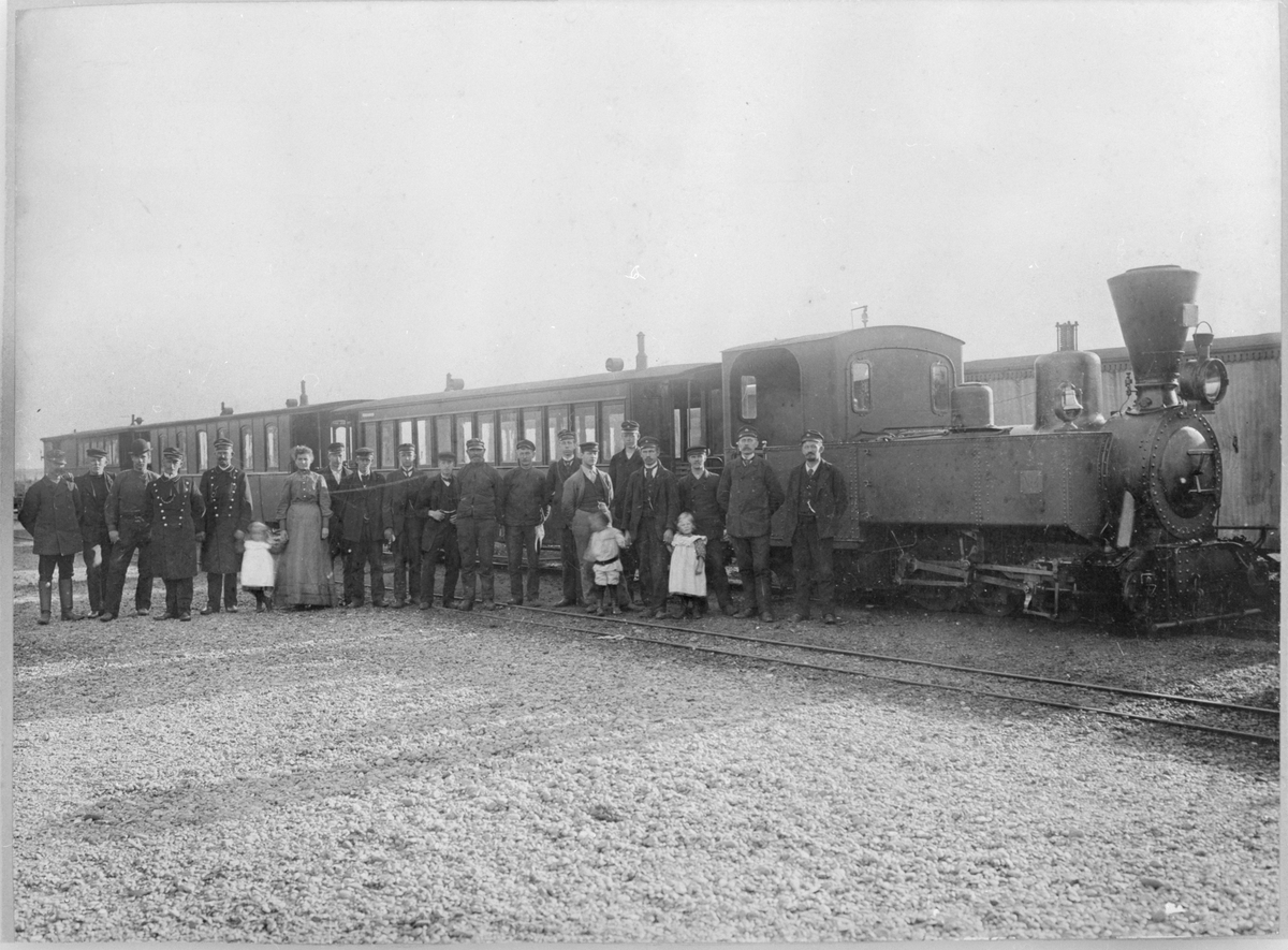 Uppställd personal vid persontåget med lok 4 och Co 8, Co 3 och CFo 20 på Råå station. Från vänster i bild banvakterna Carl Andersson och P. Magnusson, en okänd konduktör, konduktör Otto Pamp, stins Per Jönsson, fru Augusta Jönsson med dottern Ebba, lokförare Aron Andersson, eldare Pettersson, eldare Anders Lindahl, eldare Idof Christensson, putsare Sjöstedt, en okänd, konduktör Axel Kjellström, lokförare Sigfrid Göranssson, lokförare Oscar Jönsson, lokförare Magnus Nilsson med barnen Sigfrid och Sigrid, konduktör Göran Göransson, lokmästare Nils Rubin och lokförare F. Danielsson.