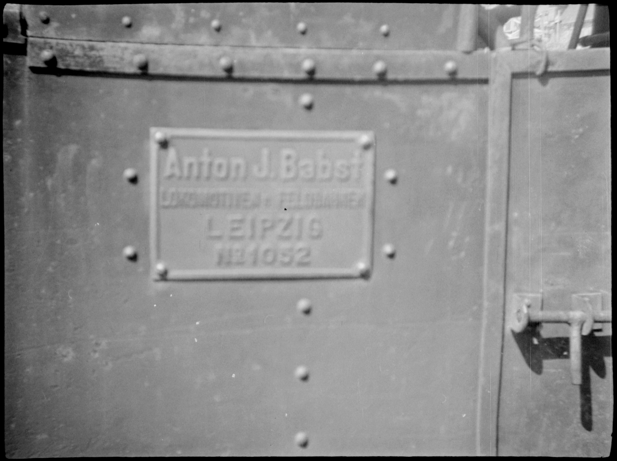 Skylt på Aspa Bruk lok 2 "Svarten", tillverkat 1918 av Zobel med tillverkningsnummer 1052.