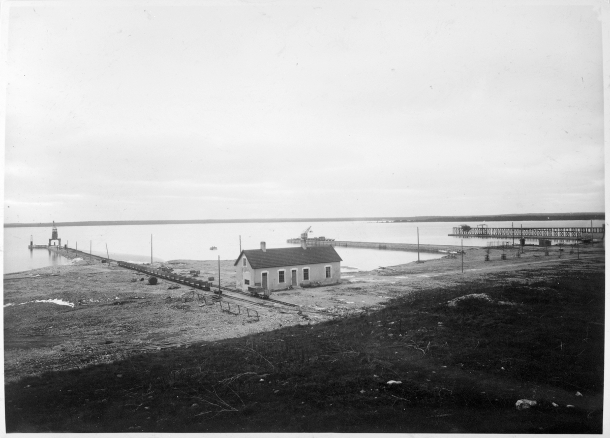Hamn på Gotland, okänt vilken. Lastning för transport av produkter från kalkbruken.
