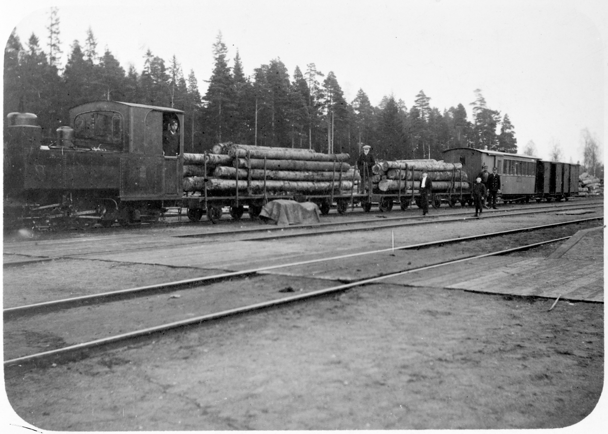 Ånglok med blandat tåg, timmervagnar, personvagn och godsvagn.
