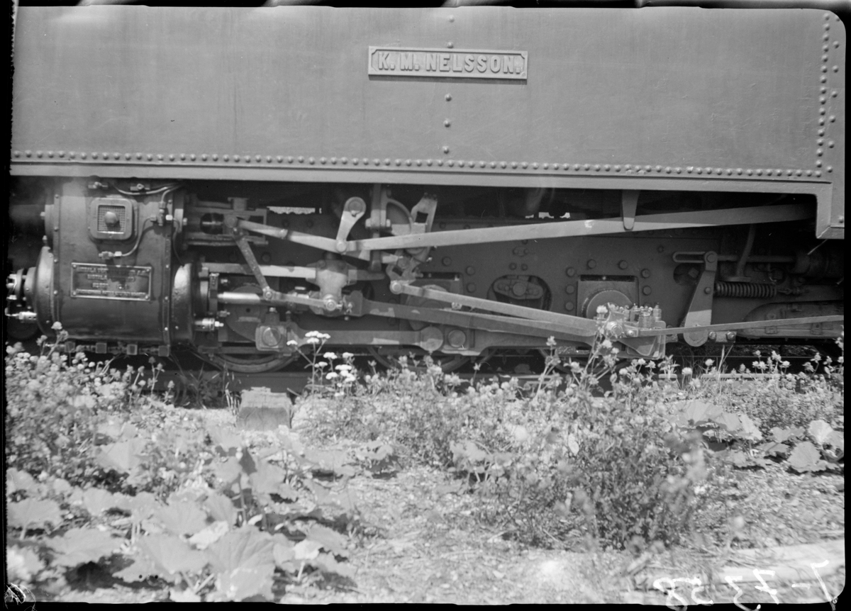 Närbild på Aspa Bruk lok 5 "K. M. Nelsson" koppelstång och hjul.