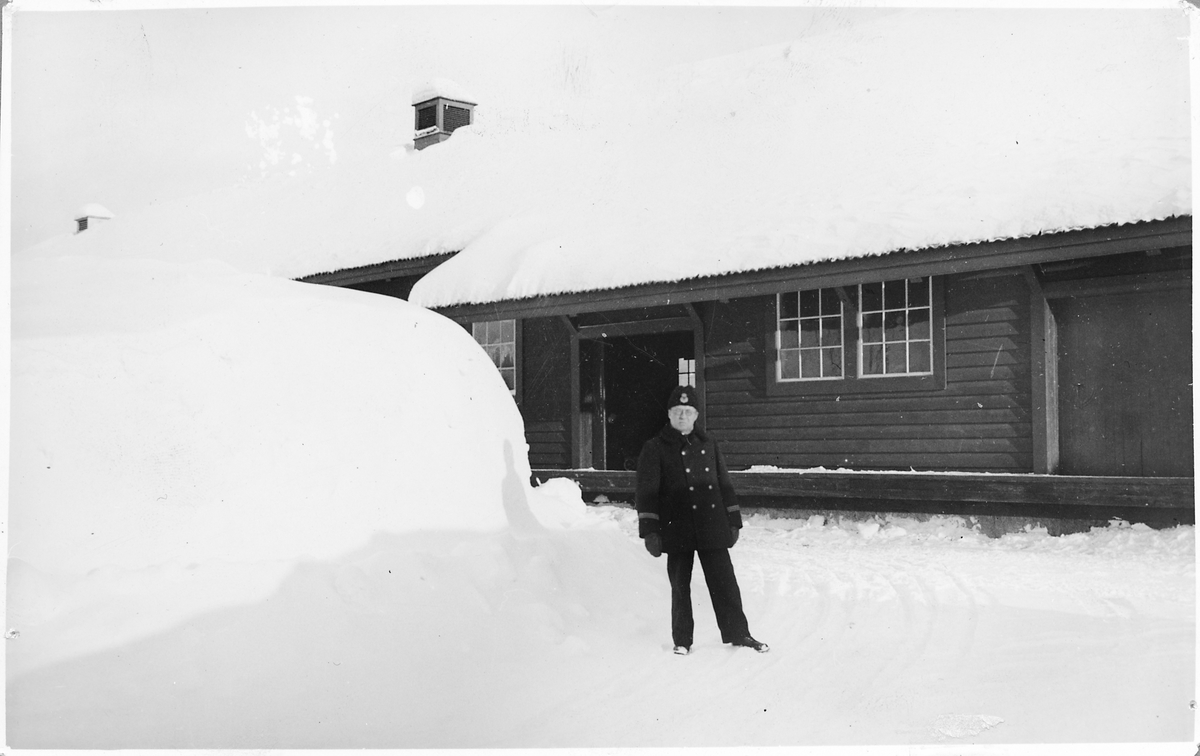 Anställd poserar bredvid snödriva. Godsmagasin i bakgrunden.