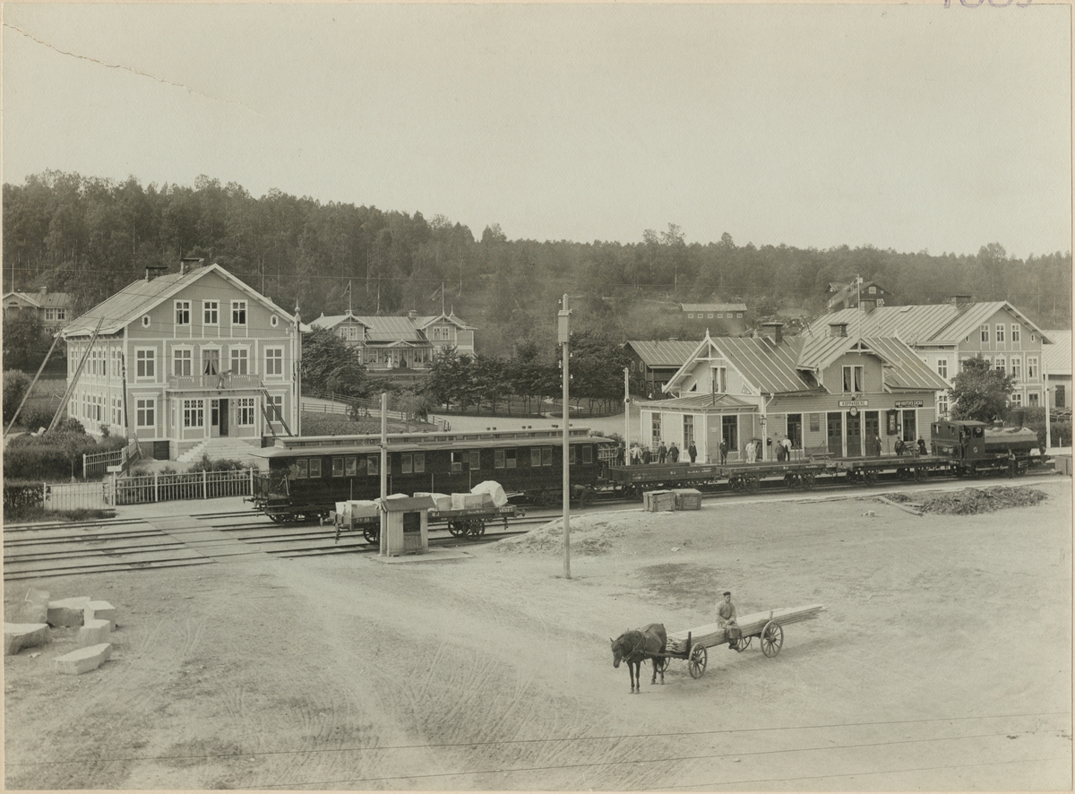 Vy över Kopparberg station med unionflaggan på toppen av flaggstången. Ett blandat tåg från Bergslagernas Järnväg står inne på stationen. Bland annat malmvagn Bergslagernas Järnväg, BJ M 3000 och vid lastplatsen står godsvagn BJ N
