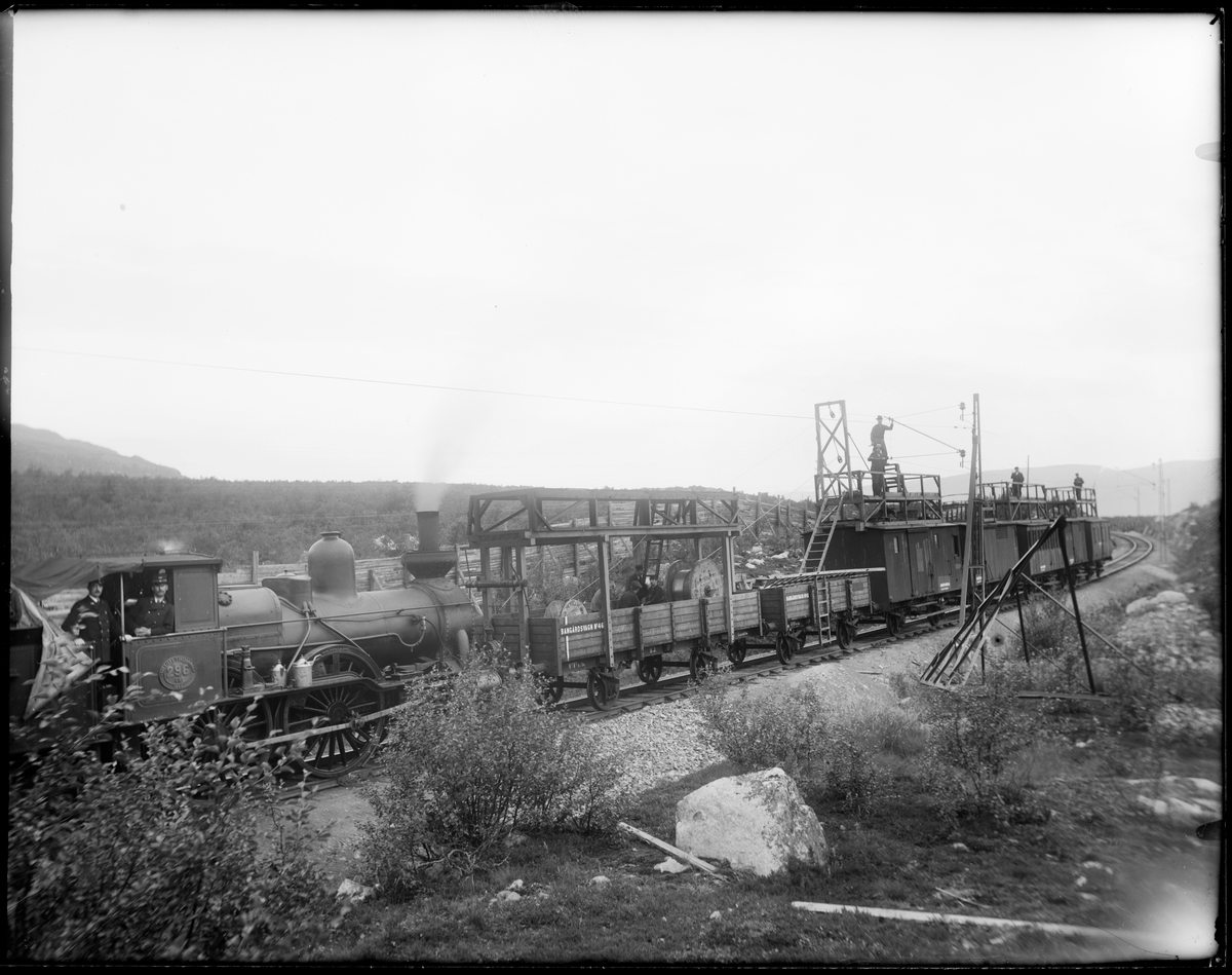 Statens Järnvägar, SJ Ca 296 med bangårdsvagnar vid elektrifieringsarbete.