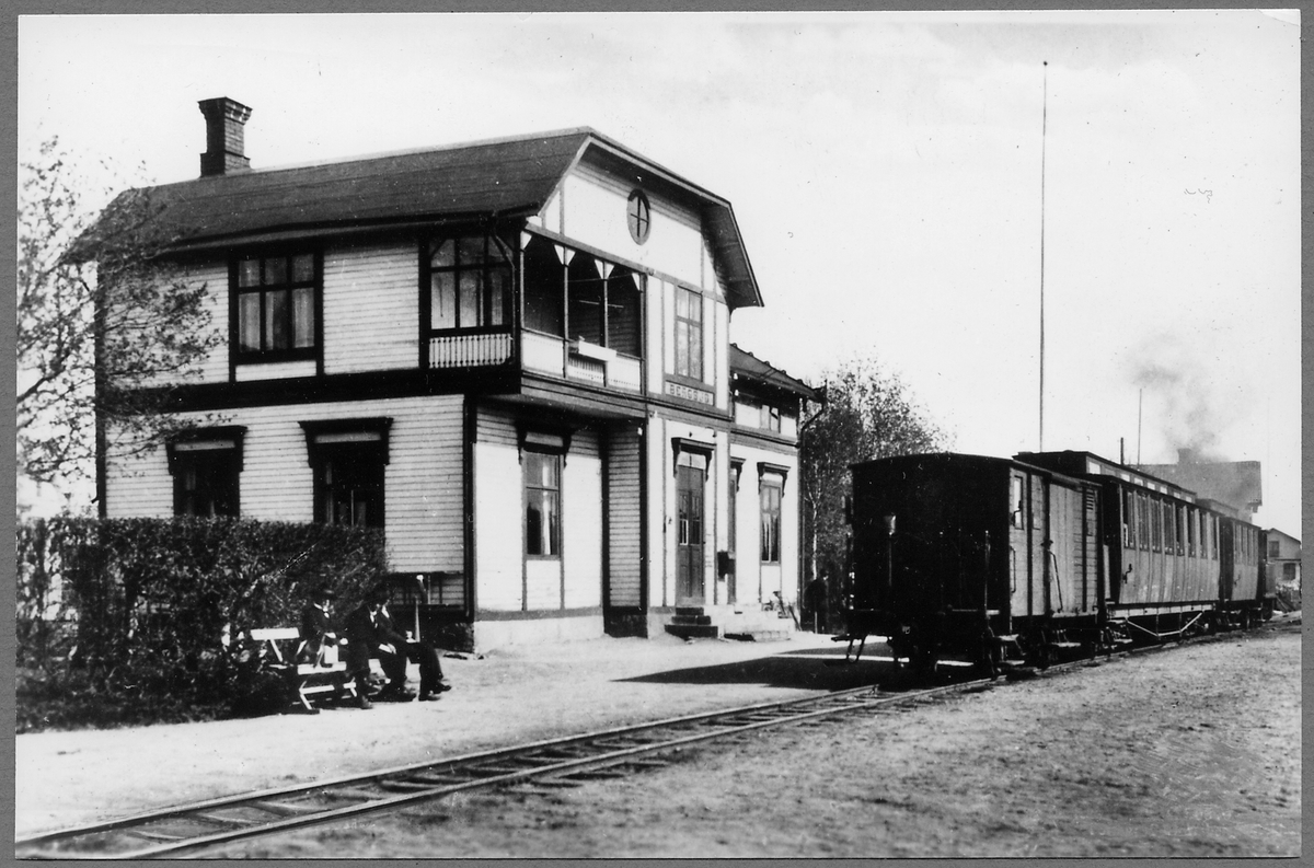 Titel: Norra Hälsingslands Järnväg, NHJ Bergsjö station. Station anlagd 1896 med tvåvånings stationshus i trä. Den upphörde 1962.