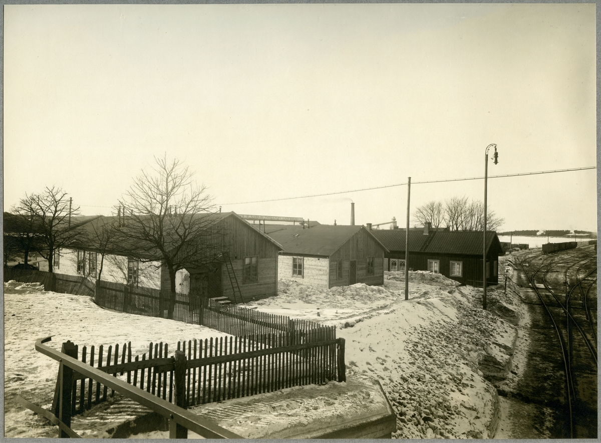 Text på bild - Nr 24. Tillhör årsrapporten för år 1916. Tvenne baracker uppförda i Nässjö år 1916. Båglampa på bangården.
