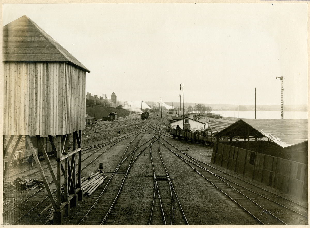 På kopia av bilden står texten - Nr 26. Tillhör årsrapporten för år 1917. Utsikt från kolgivningsbryggan i Nässjö mot personbangårdenutvisande de spårarbeten som utförts under 1917. I förgrunden torvpulvermagasin.
