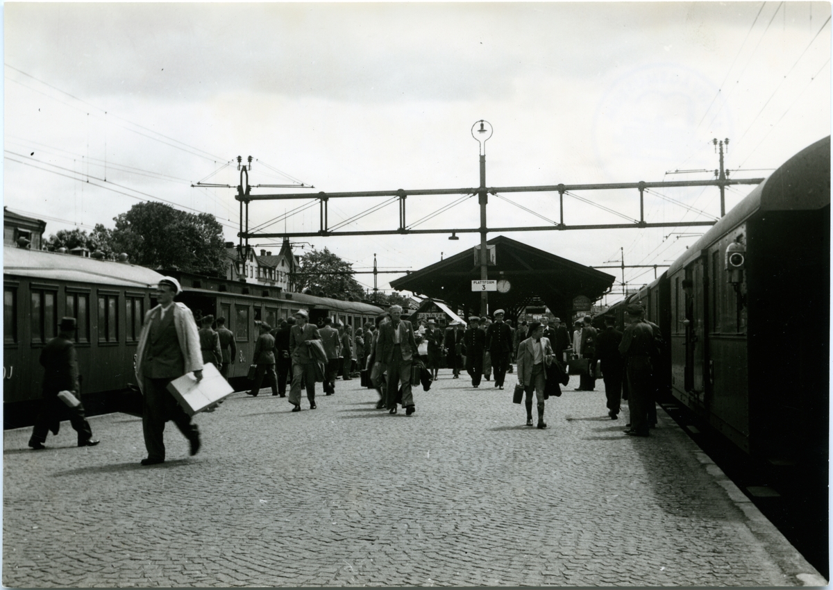 Resande på plattformen i Nässjö. Två tåg inne på stationen. till vänster tåg mot Oskarshamn.