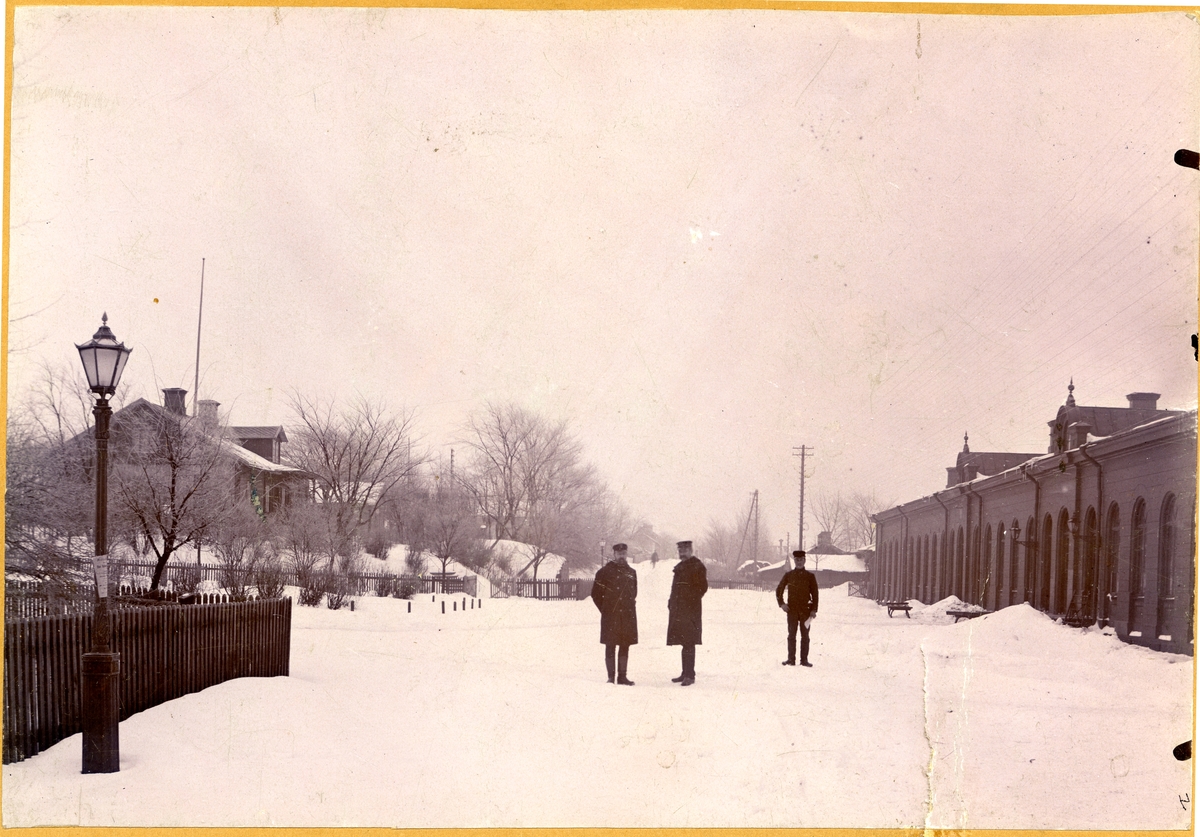 Stationshuset i Nässjö år 1895 från gatusidan. Stationsskrivare Ivar Olsson till vänster. Förste stationsskrivare Axel Wiren till höger.