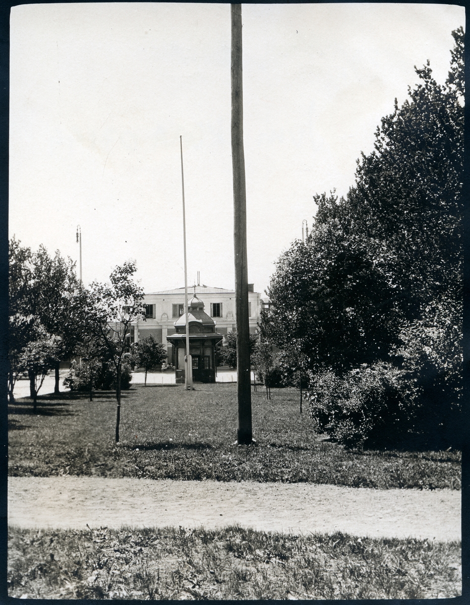 Kiosk med stationshuset i bakgrunden, Nässjö.