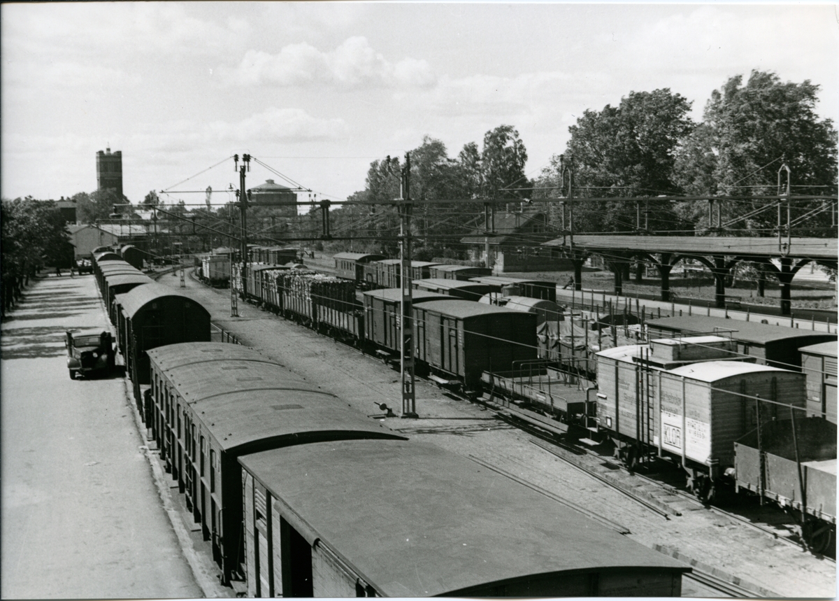 Karlstads bangård lastkaj. Vagnen till höger med upphöjning på taket är en klorvagn från Elektrokemiska fabriken i Skoghall.