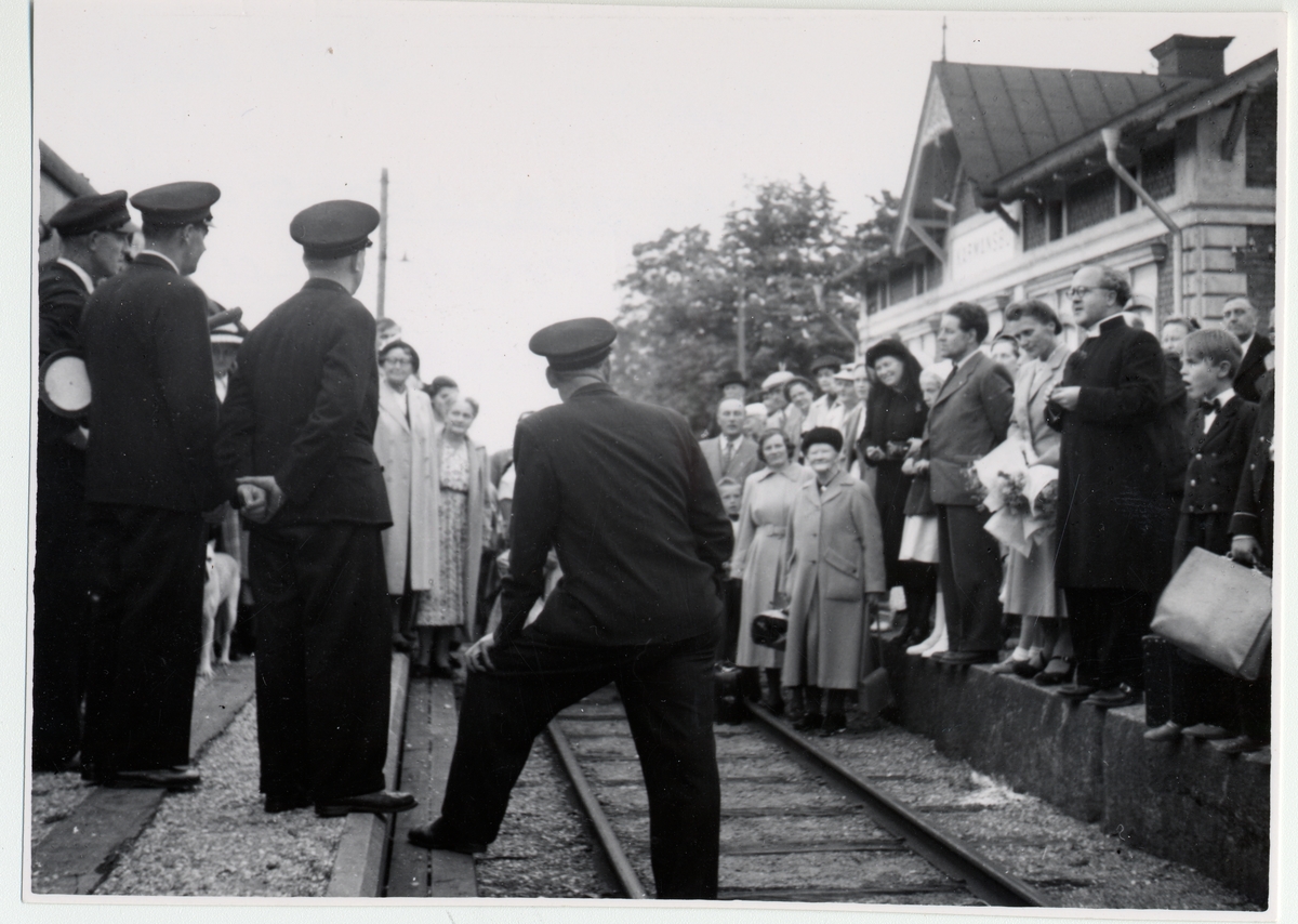 Tåg nr 1 vid Karmansbo station den 31/8 1952. Prosten Lundgren håller "avskedsgudstjänst".