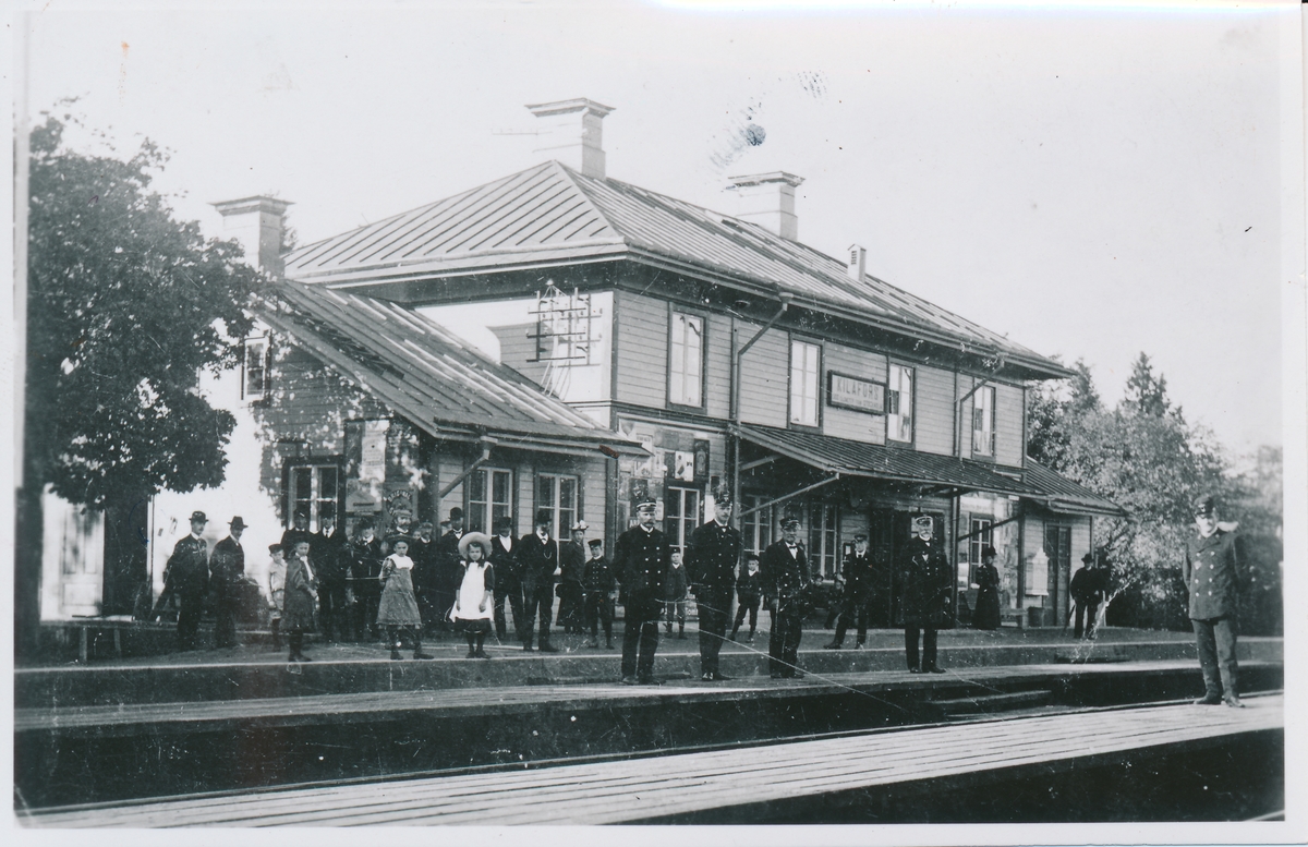Sommarbild tagen från tidigt 1900-tal på Kilafors Järnvägsstation där flertalet resenäreer och tågpersonal inväntar anklommande tåg. Spåret är ännu inte elektrificerat varpå ånglok brukades.