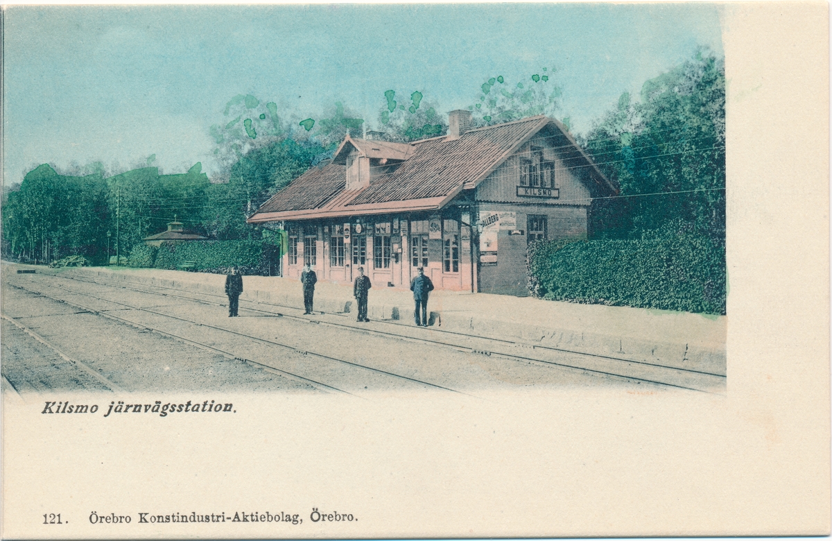 Stationspersonal framför Kilsmo järnvägsstation. Kolorerat vykort från början av 1900-talet.