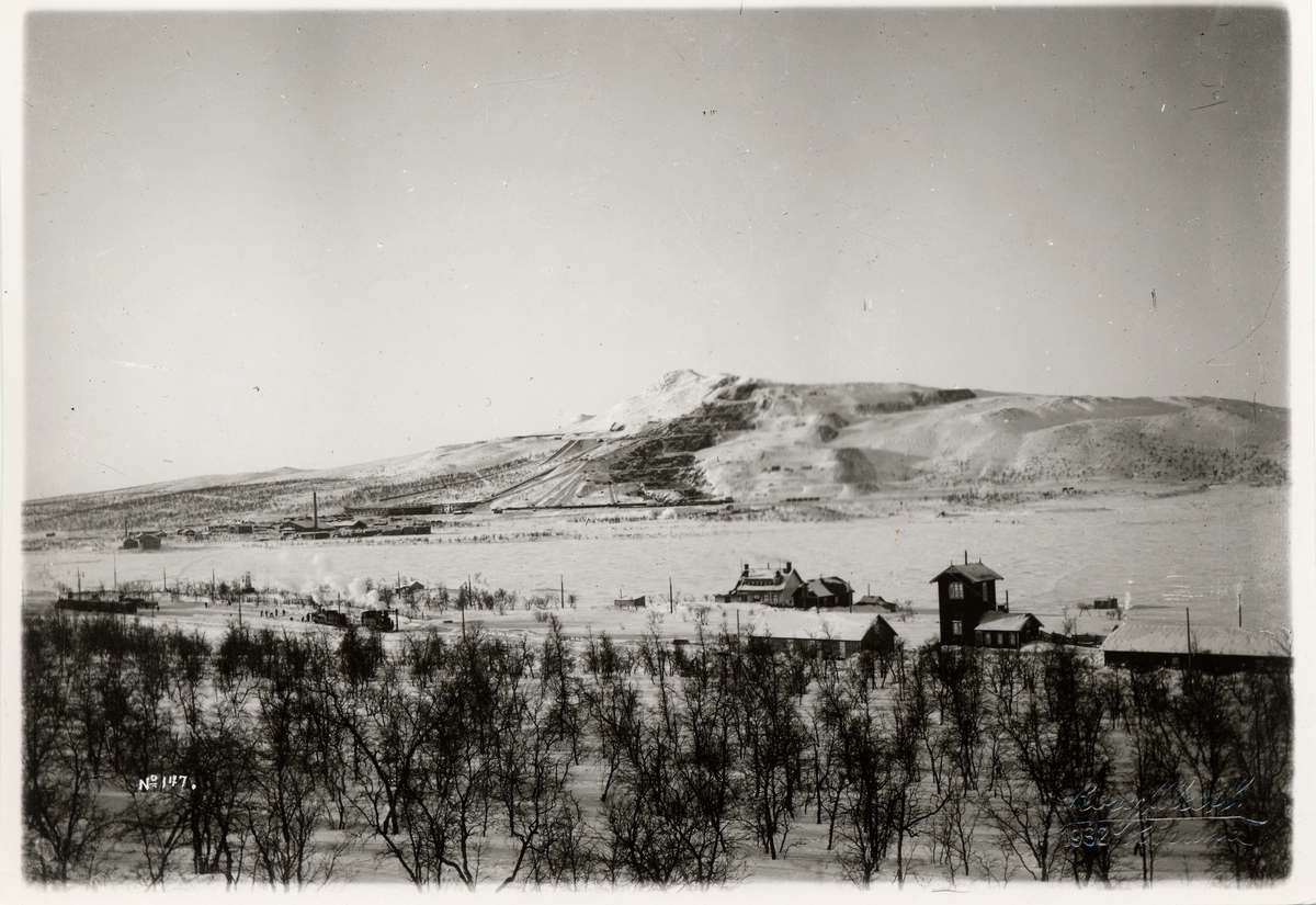 Kiirunavaara och Luossajärvi sett över gamla pumphuset och Sandbergska svagdricks-bryggeriet.
