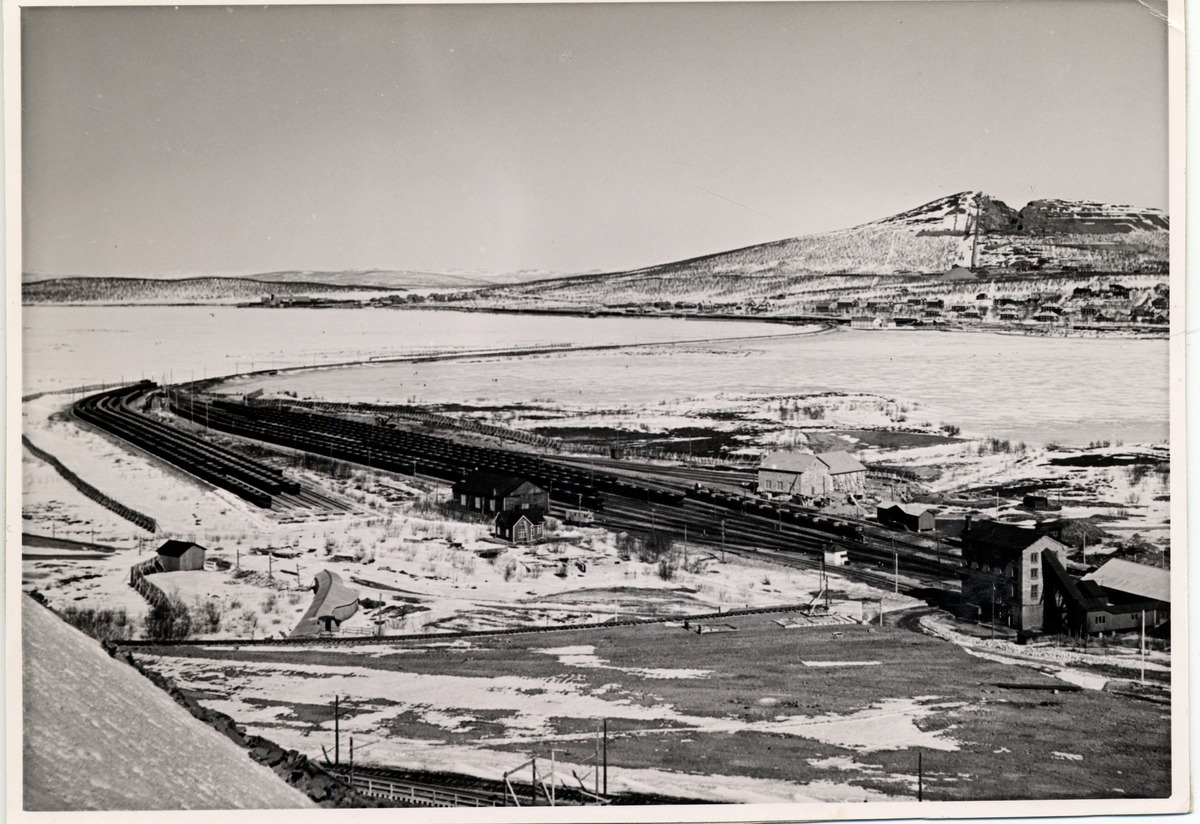 LKAB bangård med sjön Luossajärvi i bakgrunden.