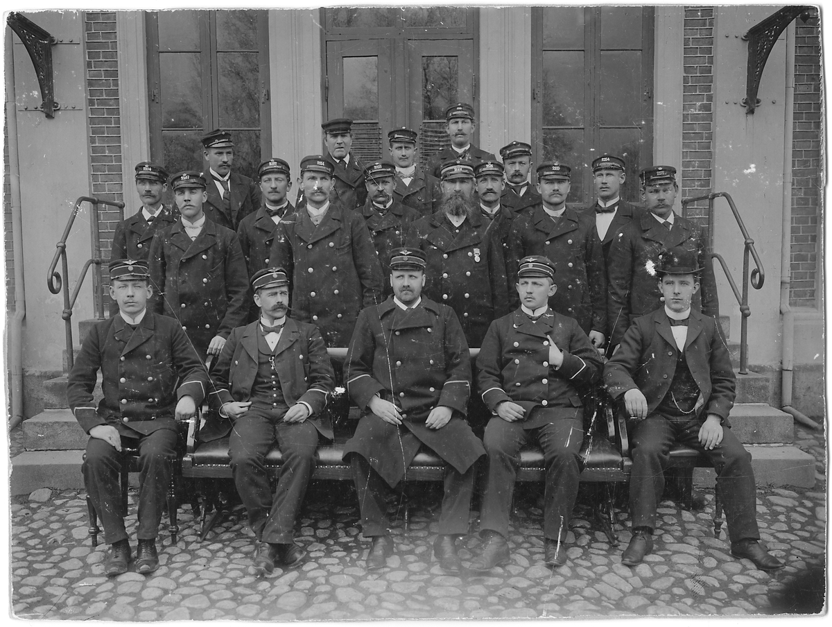 Statens Järnvägar, SJ personal uppställda utanför stationshuset för fotografering.