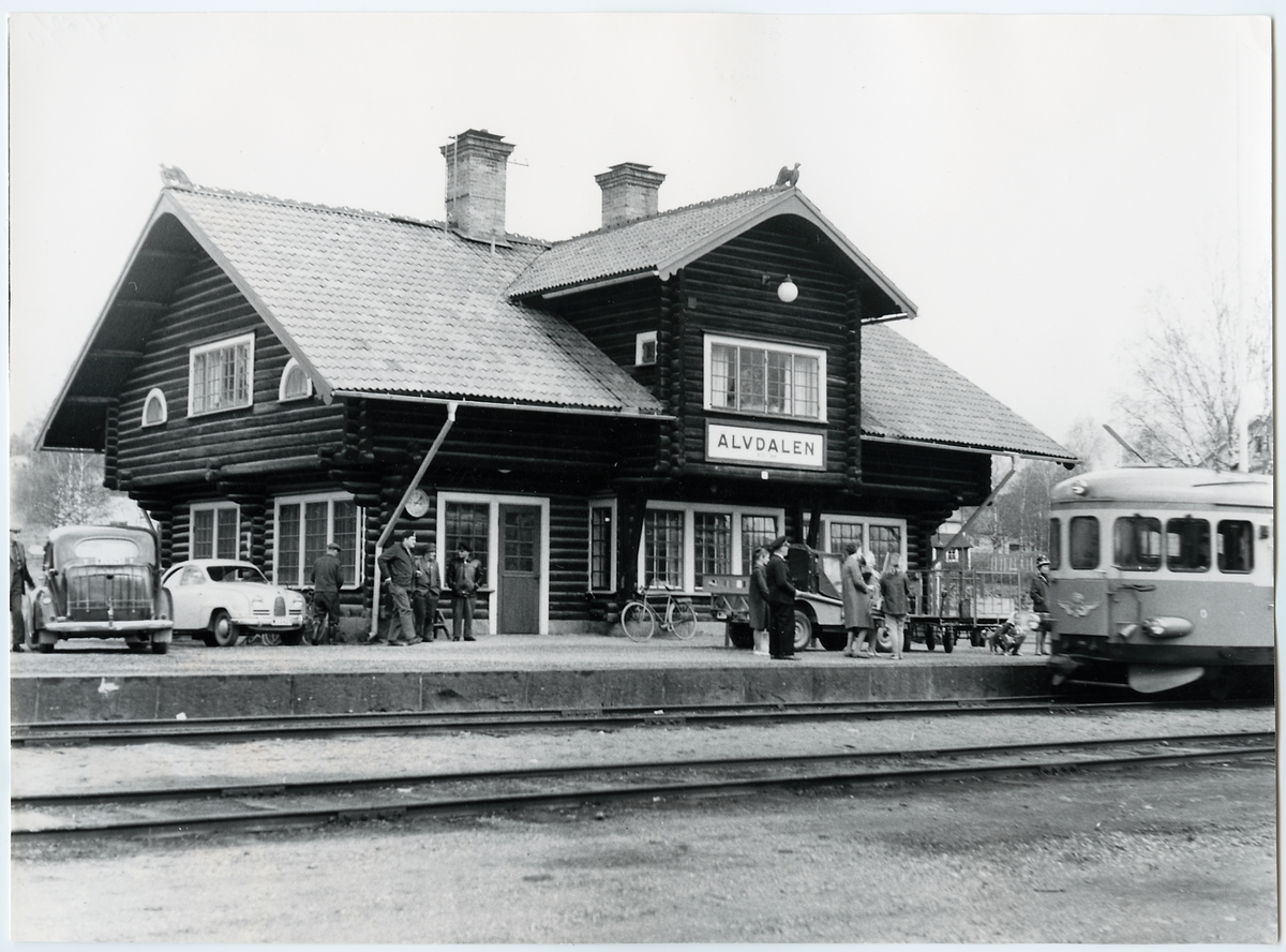 Älvdalen station. Saab 93 och Volvo 800 vid stationshuset.