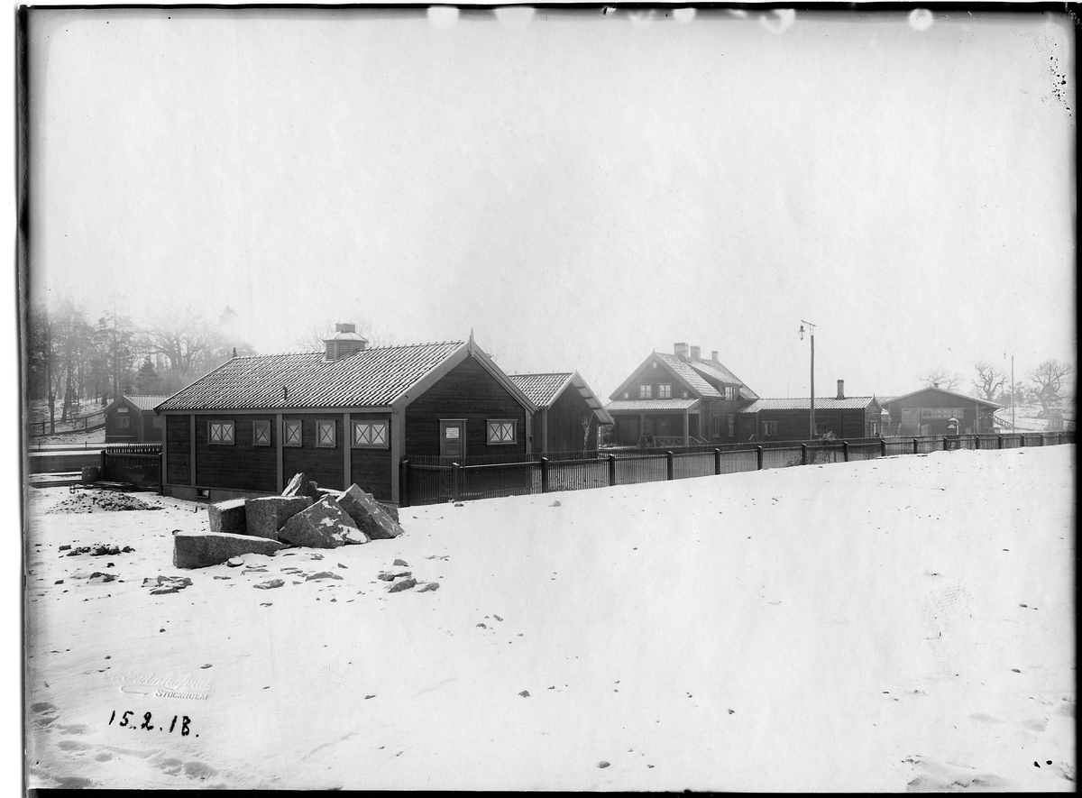 Älvsjö stationshus efter ombyggnaden. Nytt uthus och godsmagasin.