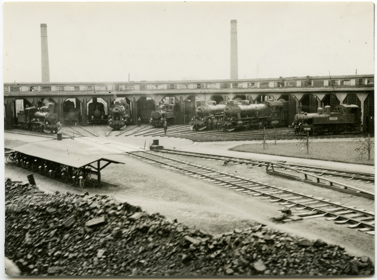Titel: Lokstallarna omedelbart före påbörjandet av elektrifieringsarbetena. Loken är från vänster Statens Järnvägar, SJ Cd, A-tender i porten, Ke/Kh, B, A-tender i porten, Ke/Kh, B, Ga2 med nyligen ilagd Bgb-panna samt Kh-lok.
