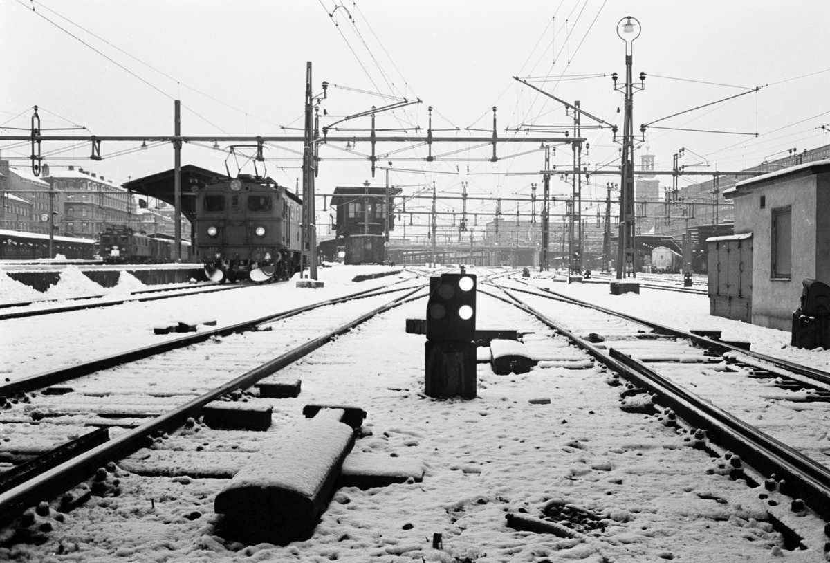 Stockholm Centralstation, vinterbild. Statens Järnvägsar SJ Da 939. Dvärgsignalen visar "Tilllåten tågrörelse". Ilgodset i bildens bortre högra del.