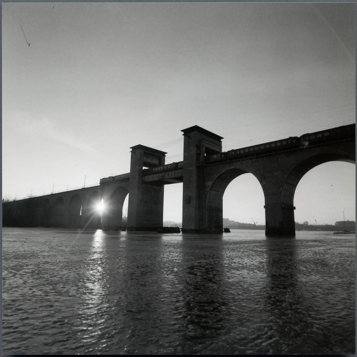 Årstabron från vattnet med staden i bakgrunden. SJ RC-lok med personvagnar passerar över fartygsfarleden.