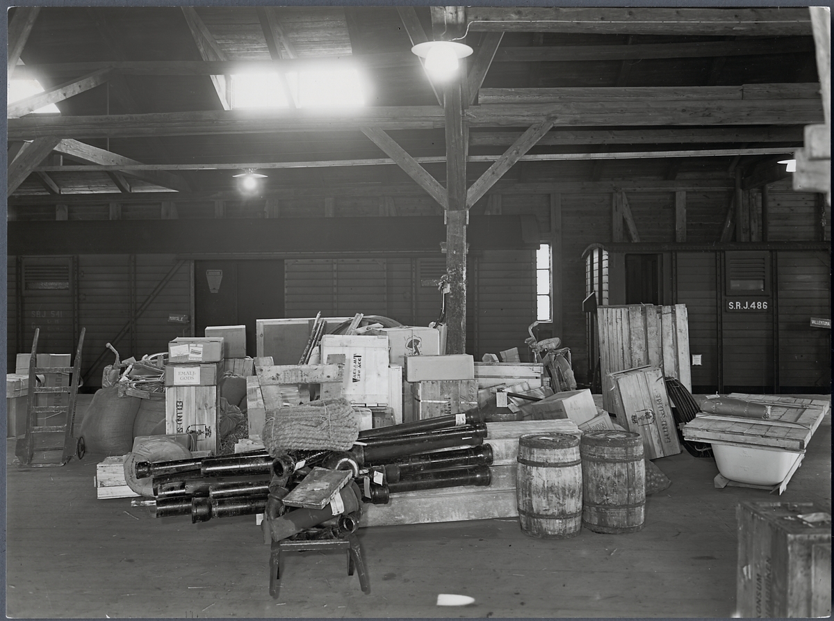 Del av godsmagasinet, Stockholm Östra. SRJ godsvagn 541 och SRJ godsvagn 486.