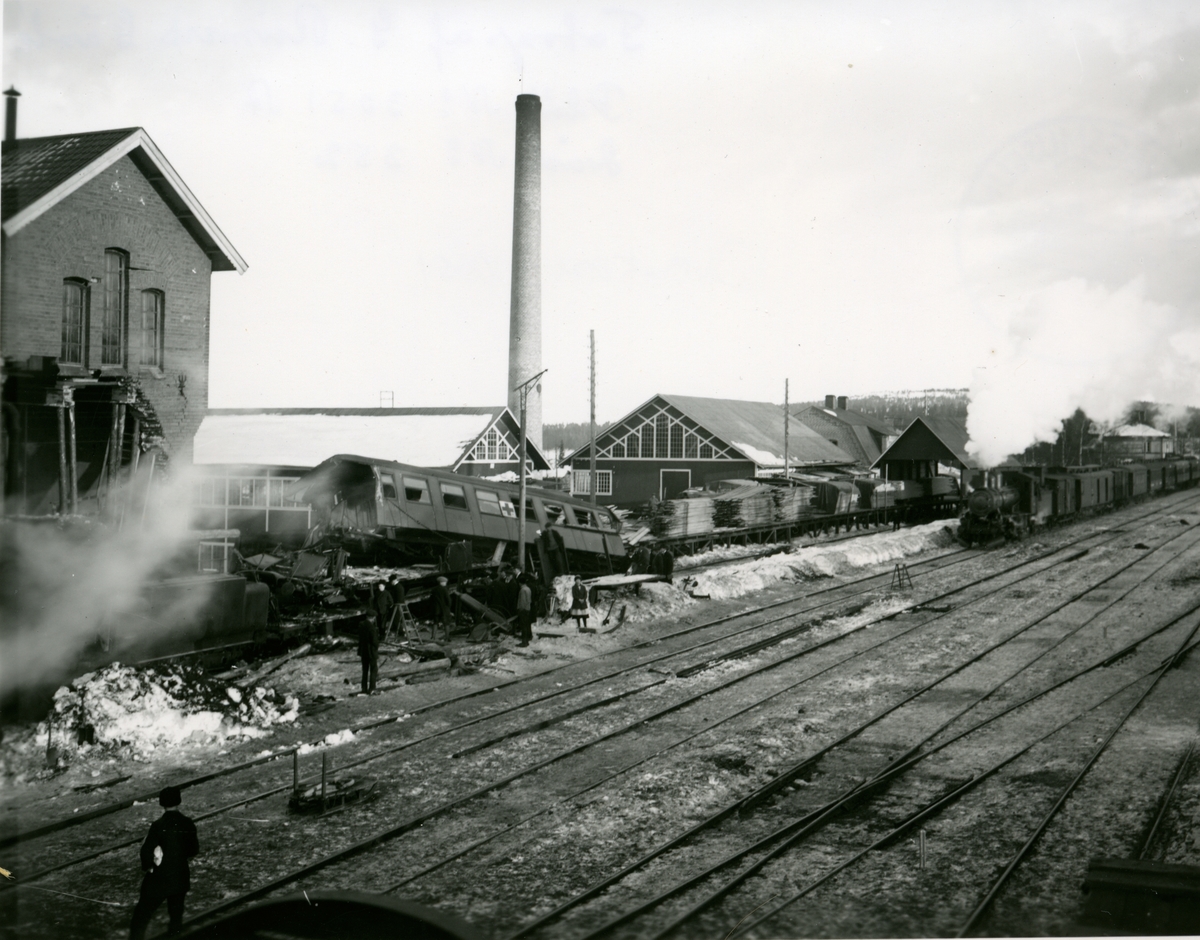 Statens Järnvägar, SJ B 1314, SJ C3d 2114. Tågolycka i Holmsveden 1917-02-16. Snälltåg 3048, draget av ånglok SJ B 1324, leddes på grund av en fellagd växel in på ett sidospår och spårade ur.