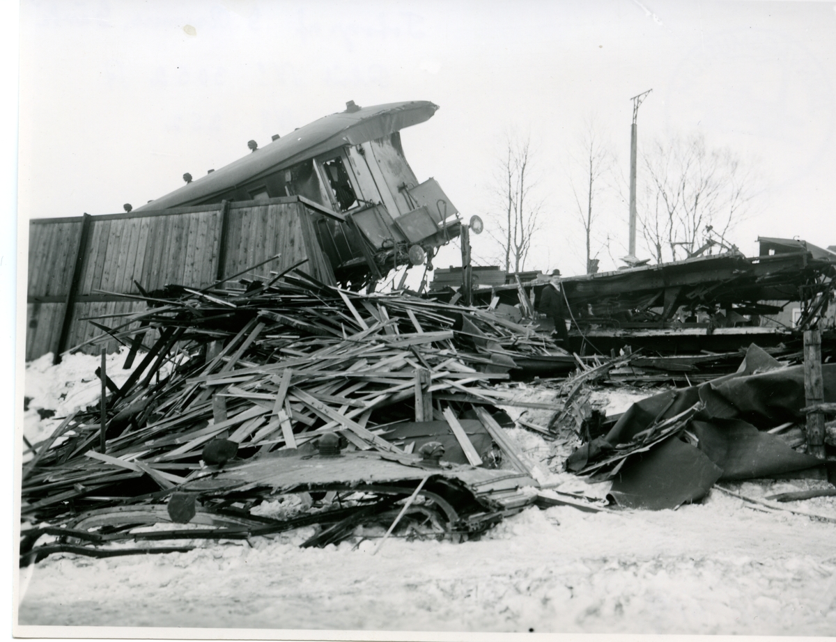 Tågolycka i Holmsveden 1917-02-16. Snälltåg 3048, draget av ånglok SJ B 1324, leddes på grund av en fellagd växel in på ett sidospår och spårade ur.