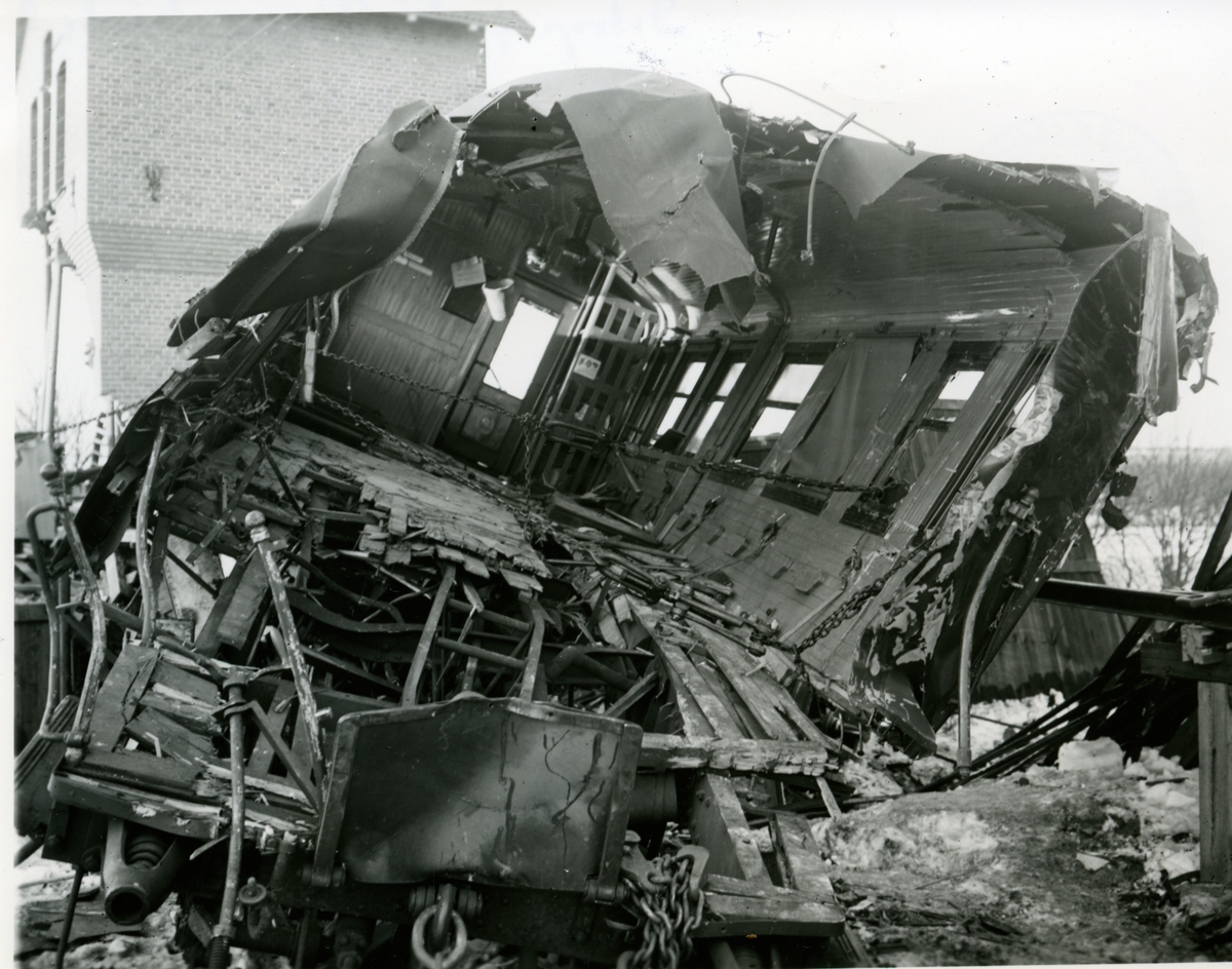 Tågolycka i Holmsveden 1917-02-16. Snälltåg 3048, draget av ånglok SJ B 1324, leddes på grund av en fellagd växel in på ett sidospår och spårade ur.