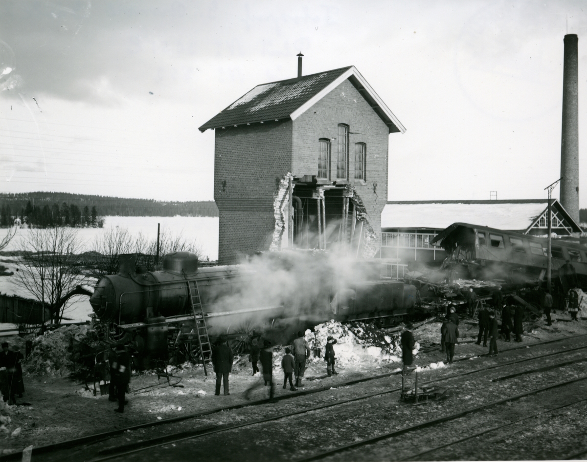 Statens Järnvägar, SJ B 1314, SJ C3d 2114. Tågolycka i Holmsveden 1917-02-16. Snälltåg 3048, draget av ånglok SJ B 1324, leddes på grund av en fellagd växel in på ett sidospår och spårade ur.