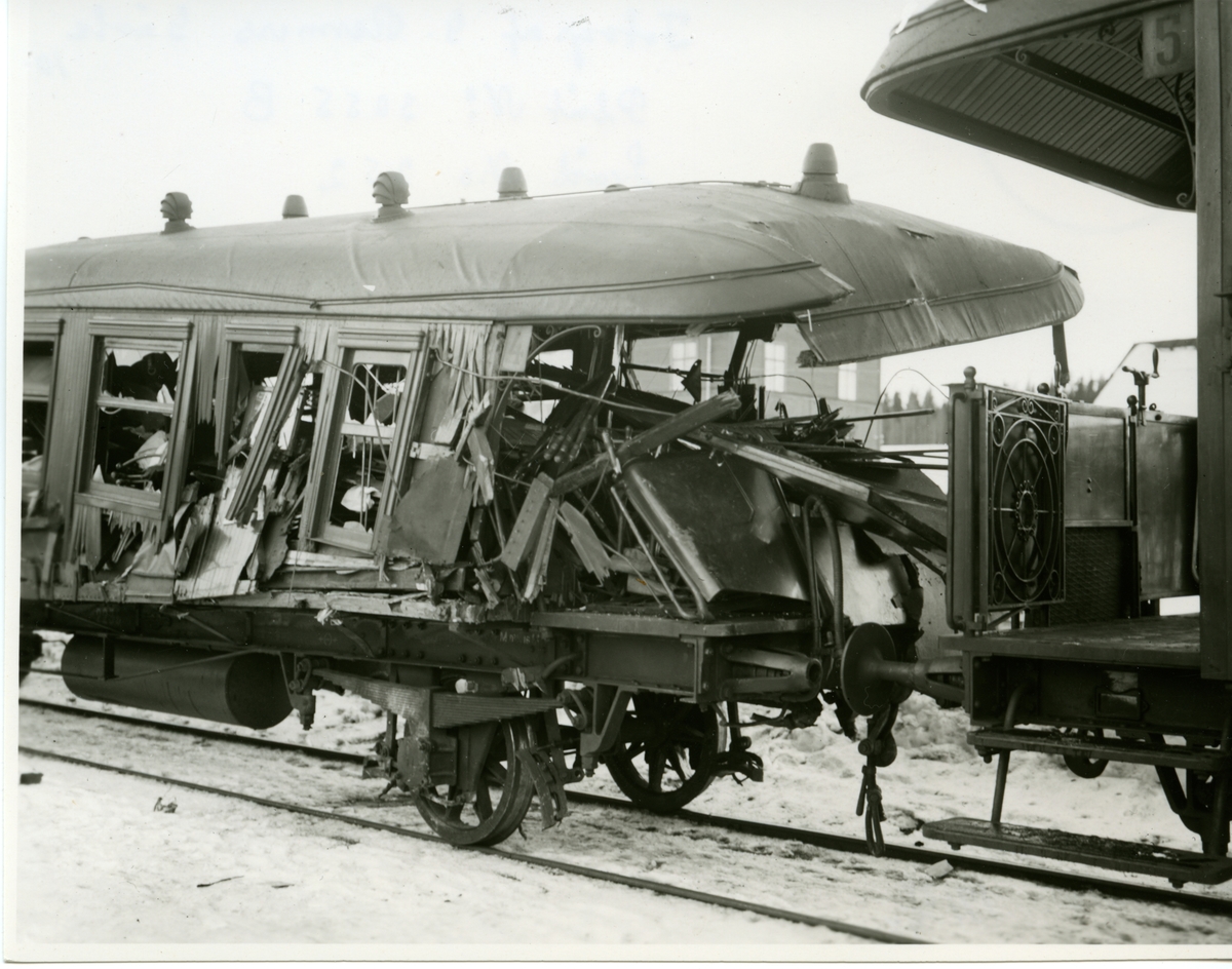 Tågolycka i Holmsveden 1917-02-16. Snälltåg 3048, draget av ånglok SJ B 1324, leddes på grund av en fellagd växel in på ett sidospår och spårade ur.
