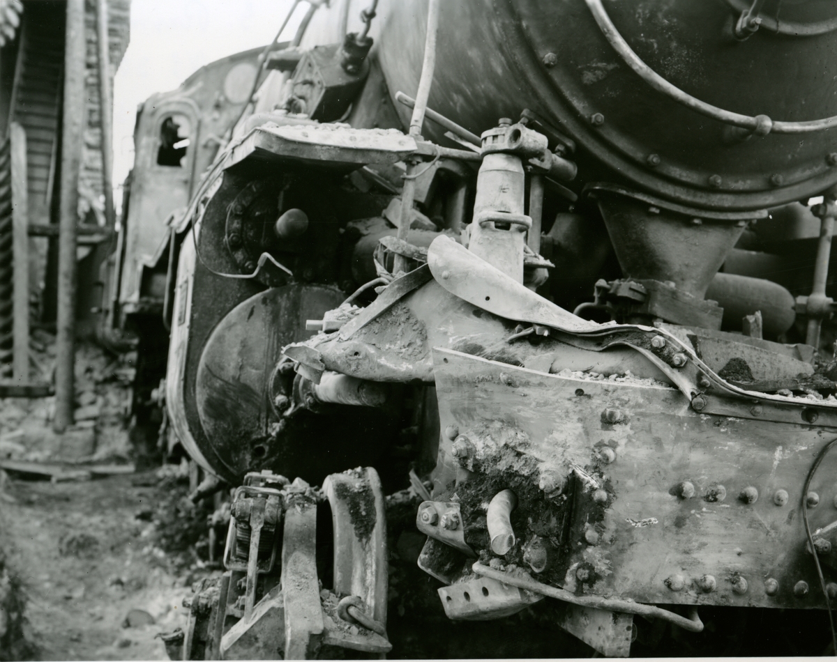 Titel: Statens Järnvägar, SJ B 1314. Tågolycka i Holmsveden 1917-02-16. Snälltåg 3048, draget av ånglok SJ B 1324, leddes på grund av en fellagd växel in på ett sidospår och spårade ur.