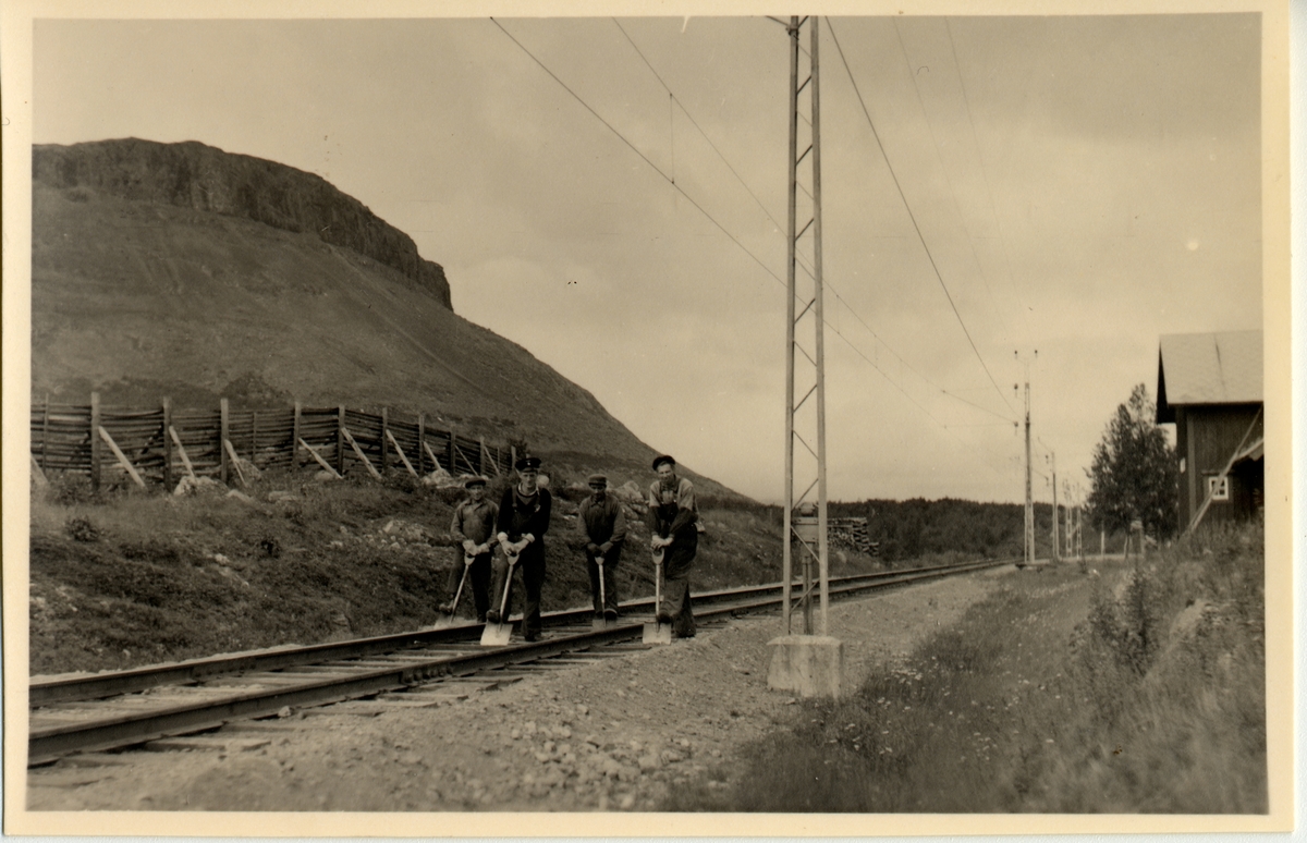 Kaisaniemi. Fyra glada banarbetare utmed spåret vilar på sina spadar. Järnvägen elektrifierades 1915.