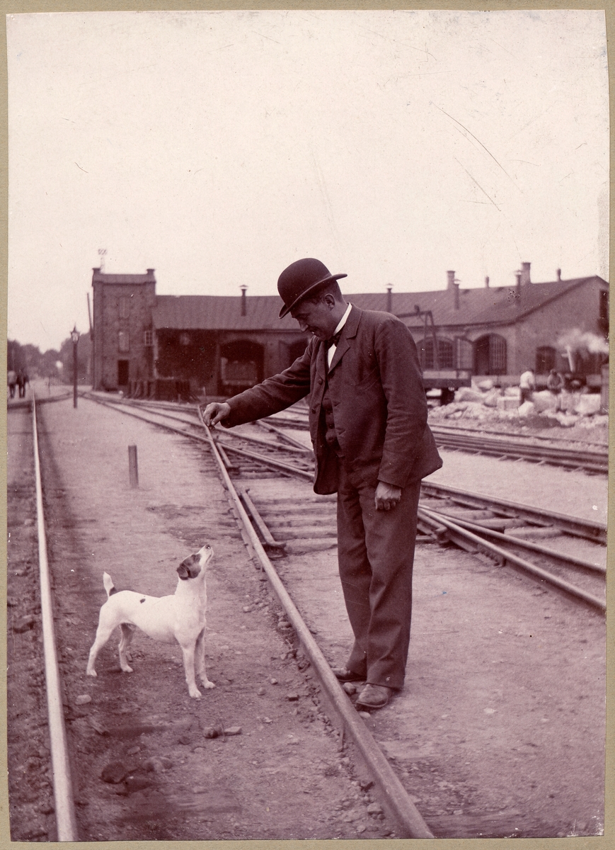 Man med hund. I bakgrunden syns Kalmar lokstall .