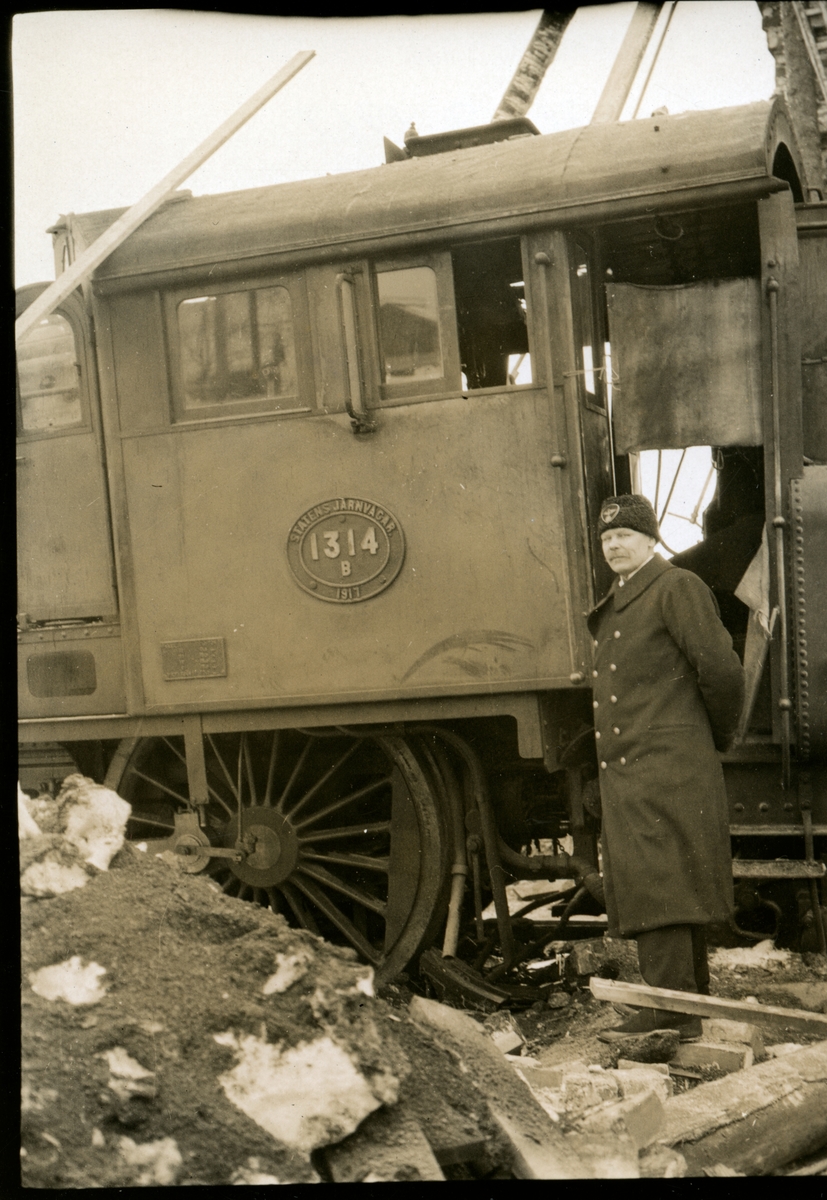 Statens Järnvägar, SJ B 1314. Tågolycka i Holmsveden 1917-02-16. Snälltåg 3048, draget av ånglok SJ B 1324, leddes på grund av en fellagd växel in på ett sidospår och spårade ur.
