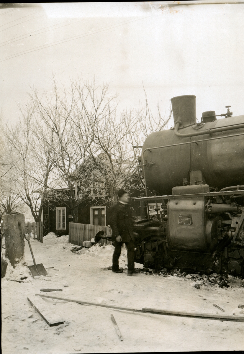 Statens Järnvägar, SJ B 1314. Tågolycka i Holmsveden 1917-02-16. Snälltåg 3048, draget av ånglok SJ B 1324, leddes på grund av en fellagd växel in på ett sidospår och spårade ur.