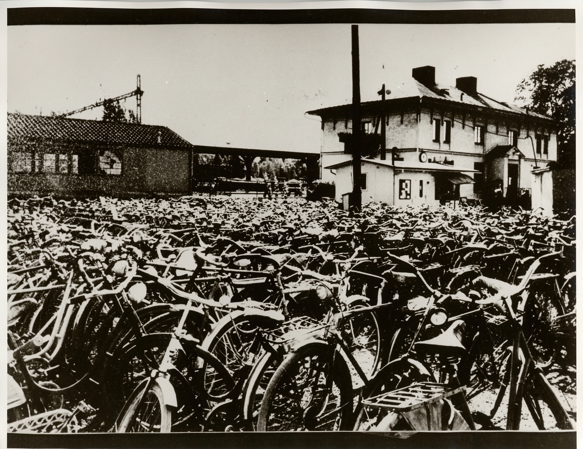 Cyklar parkerade utanför stationshuset.