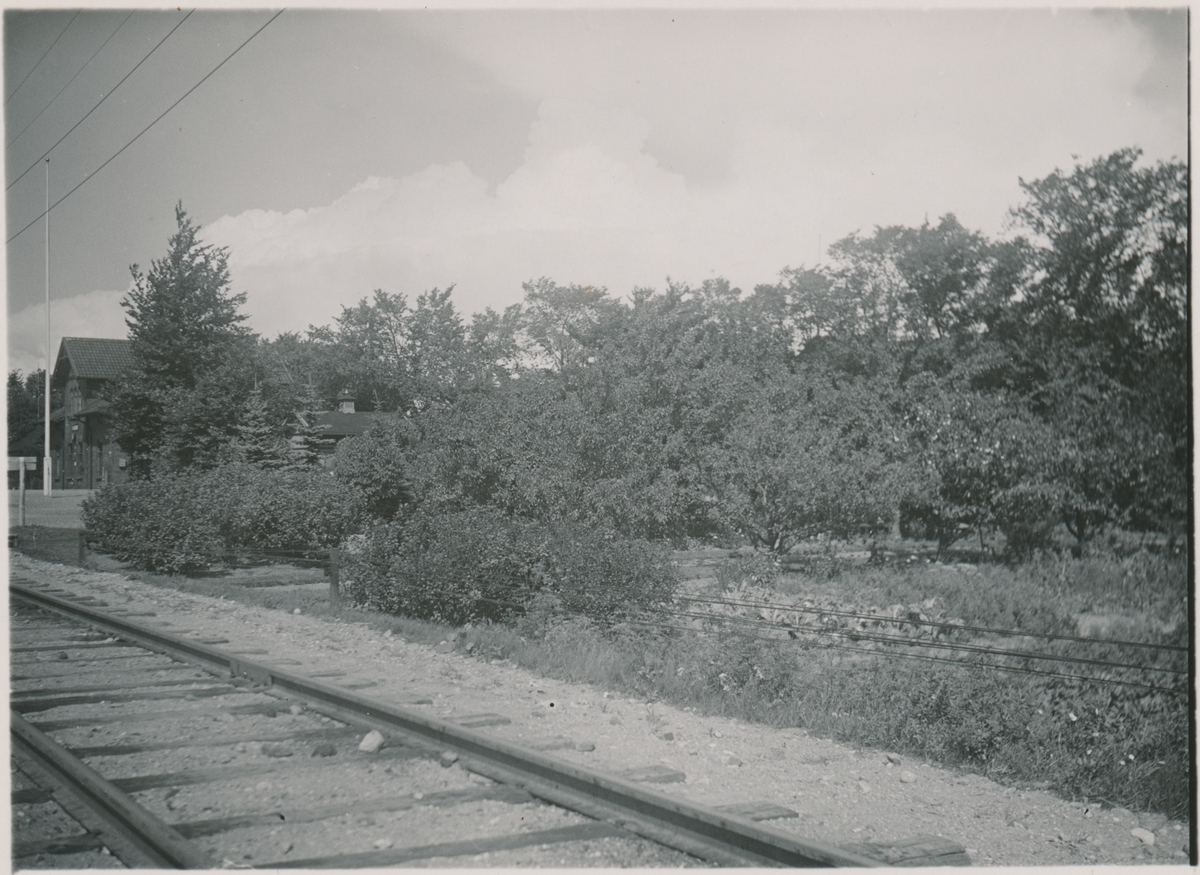 Östra Grevie. Malmö-Kontinentens Järnväg, MkontJ. Bostadsträdgård i anslutning till Östra Grevie station, en del av träden rikt besatta med frukt. Öppnades 1886. Övergick till Statens Järnvägar, SJ 1909. Eldrift 1933. Stavades Östra Grefvie fram till 1/10 1916. Nedlagd 1/2 1973 .