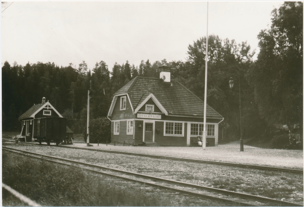 Österskärs station. Stockholm-Rimbo Järnväg, SRJ.Öppnad 1906. Eldrift 1939. Övergick till Statens Järnvägar, SJ 1959.