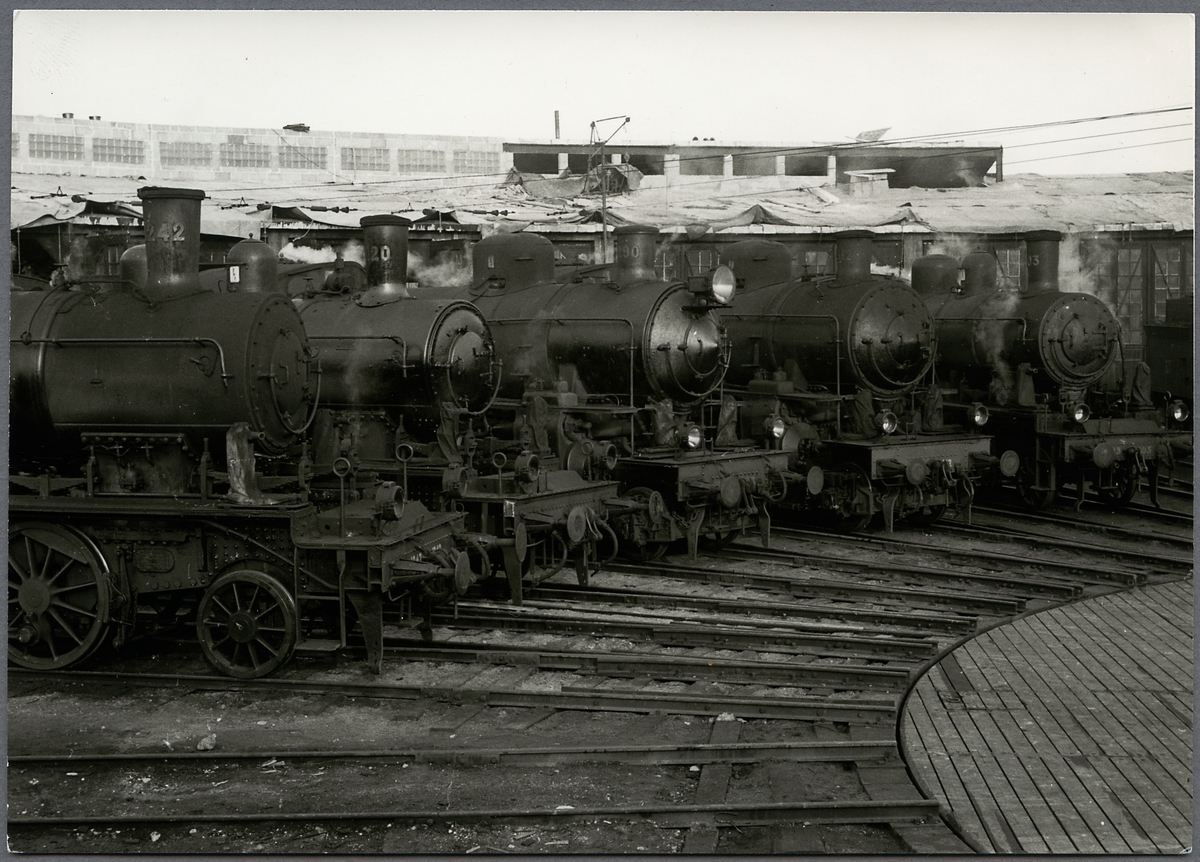 Lokstallarna vid Sundsvalls station med loken fr.v Statens Järnvägar, SJ E2 1242, SJ E2 1120, SJ B 1290, SJ B 1312, SJ E2 903.